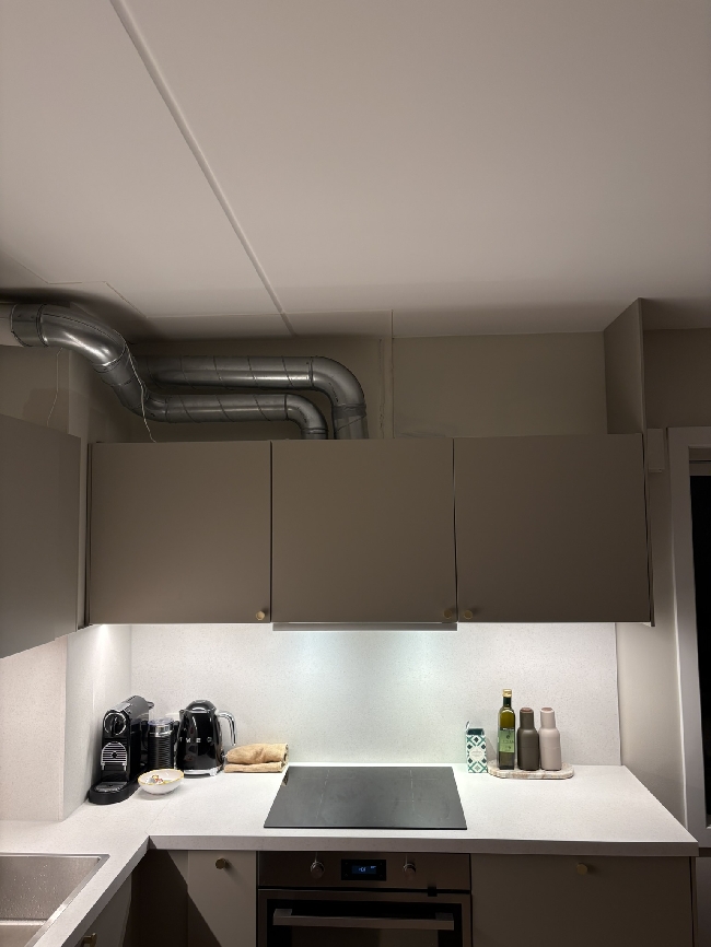 Jeg trenger hjelp til å fore inn ventilasjonsrør oppe i taket som går over kjøkkenet. Vi har dekksider fra IKEA som skal passe. Foringen er på mellom 40 - 50 cm høy og deler av ventilasjonsøret stikker utenfor kjøkkenløsningen, vi trenger derfor også å få bokset inn den sammen med foringen, sannsynligvis med gipsplater.