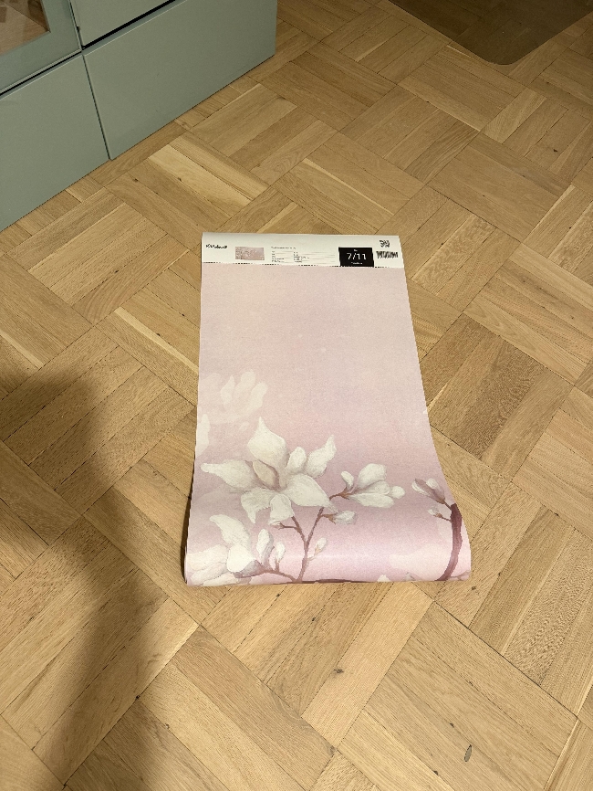 Legge tapet på vegg på ca 4.6 m i bredde og 2.6m i høyde, på toppen av eksisterende tapet. Tapetet kommer i 2 ruller som må skjæres i 11 biter. Det er bestilt på mål og er et stort bilde som skal dekke 1 vegg i barnerom. Se bilde for tapet på rull og hvordan den skal se ut.