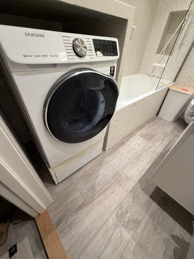 Løfte opp vaskemaskin, fjerne underskap, avbalansere vaskemaskinen.