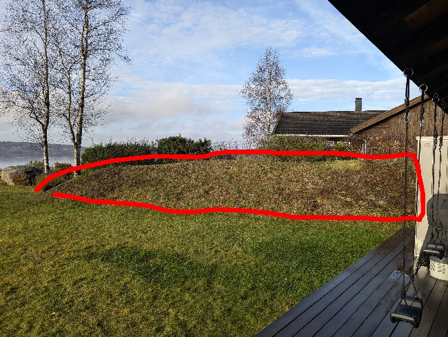 Fjerne ugress og jord fra skråning. Skråningen er ca 29 kvm og består av stein med et tynt lag jord på toppen (ca 5-10 cm). Skal graves ned til stein og flyttes ca 20 meter for dumping. Se bilde med merking av område som skal graves opp.
